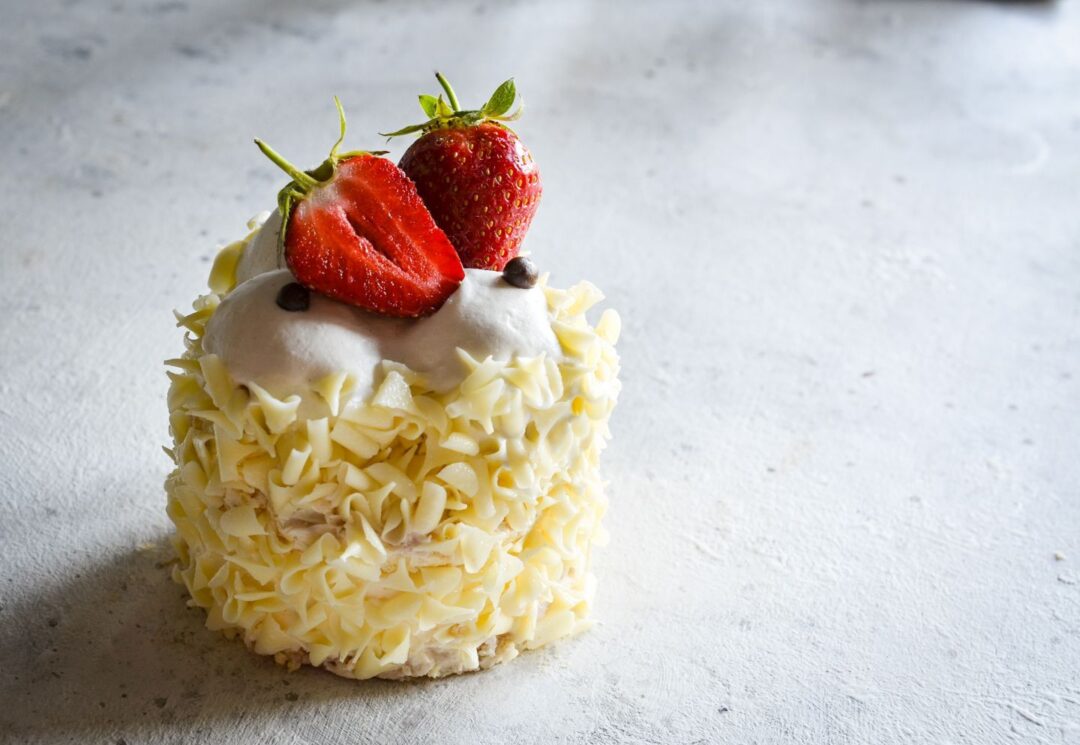 képviselőfánkkal, fehércsoki köntösben, eperrel a tetején